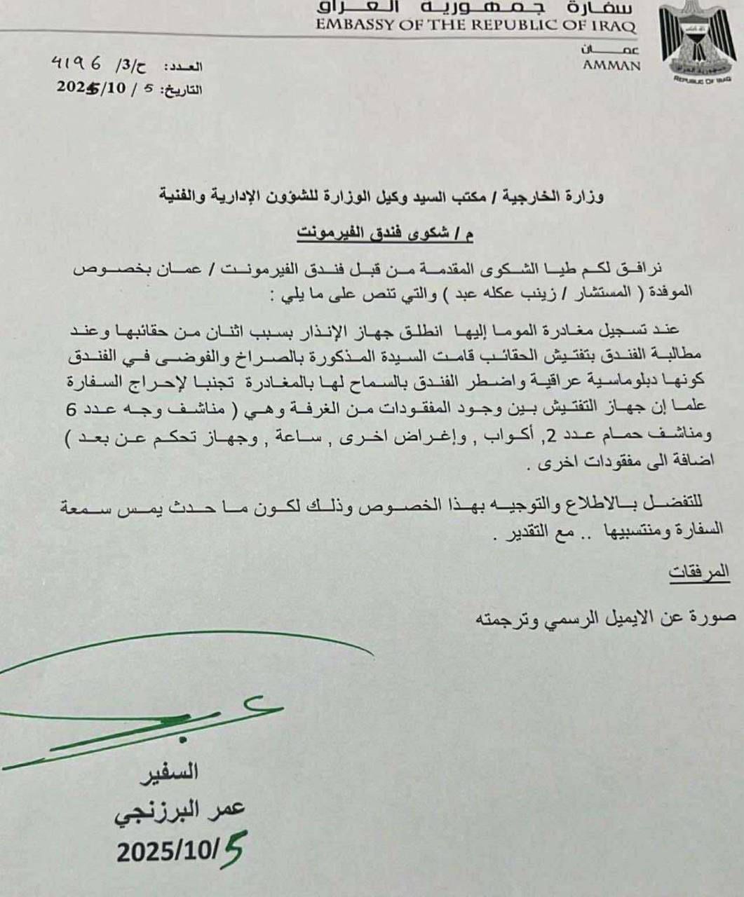 قناة النهرين الفضائية - تقدم فندق "الفيرمونت" في العاصمة الاردنية عمان بشكوى ضد مستشارة في وزارة الخارجية العراقية على خلفية وجود مفقودات في حقيبتيها اثناء مغادرتها الفندق.