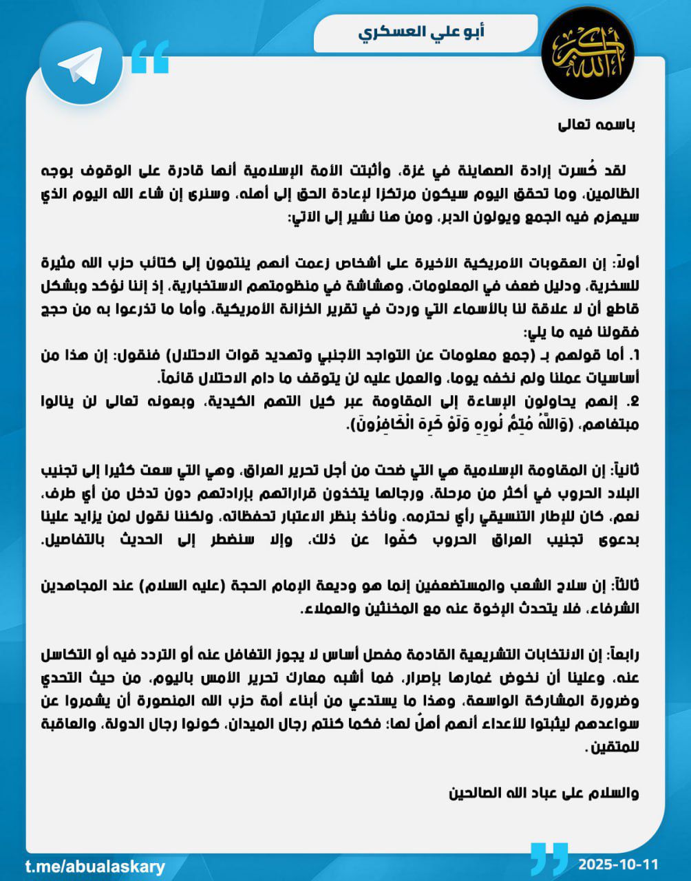 وقال العسكري في بيان تابعته "النهرين"، إنه "لقد كسرت إرادة الصهاينة في غزة وأثبتت الأمة الإسلامية أنها قادرة على الوقوف بوجه الظالمين وما تحقق اليوم سيكون مرتكزاً لإعادة الحق إلى أهله وسنرى إن شاء الله اليوم الذي سيهزم فيه الجمع ويولون الدبر ومن هنا نشير إلى إن العقوبات الأميركية الأخيرة على أشخاص زعمت أنهم ينتمون إلى كتائب حزب الله، مثيرة للسخرية، ودليل ضعف في المعلومات وهشاشة في منظوماتهم الاستخبارية، إذ إننا نؤكد وبشكل قاطع أن لا علاقة لنا بالأسماء التي وردت في تقرير الخزانة الأميركية".