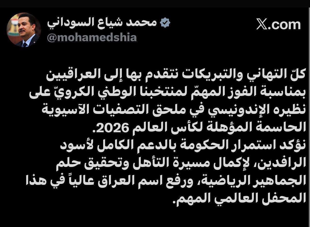 بارك رئيس مجلس الوزراء محمد شياع السوداني، فوز المنتخب العراقي لكرة القدم على نظيره الإندونيسي.