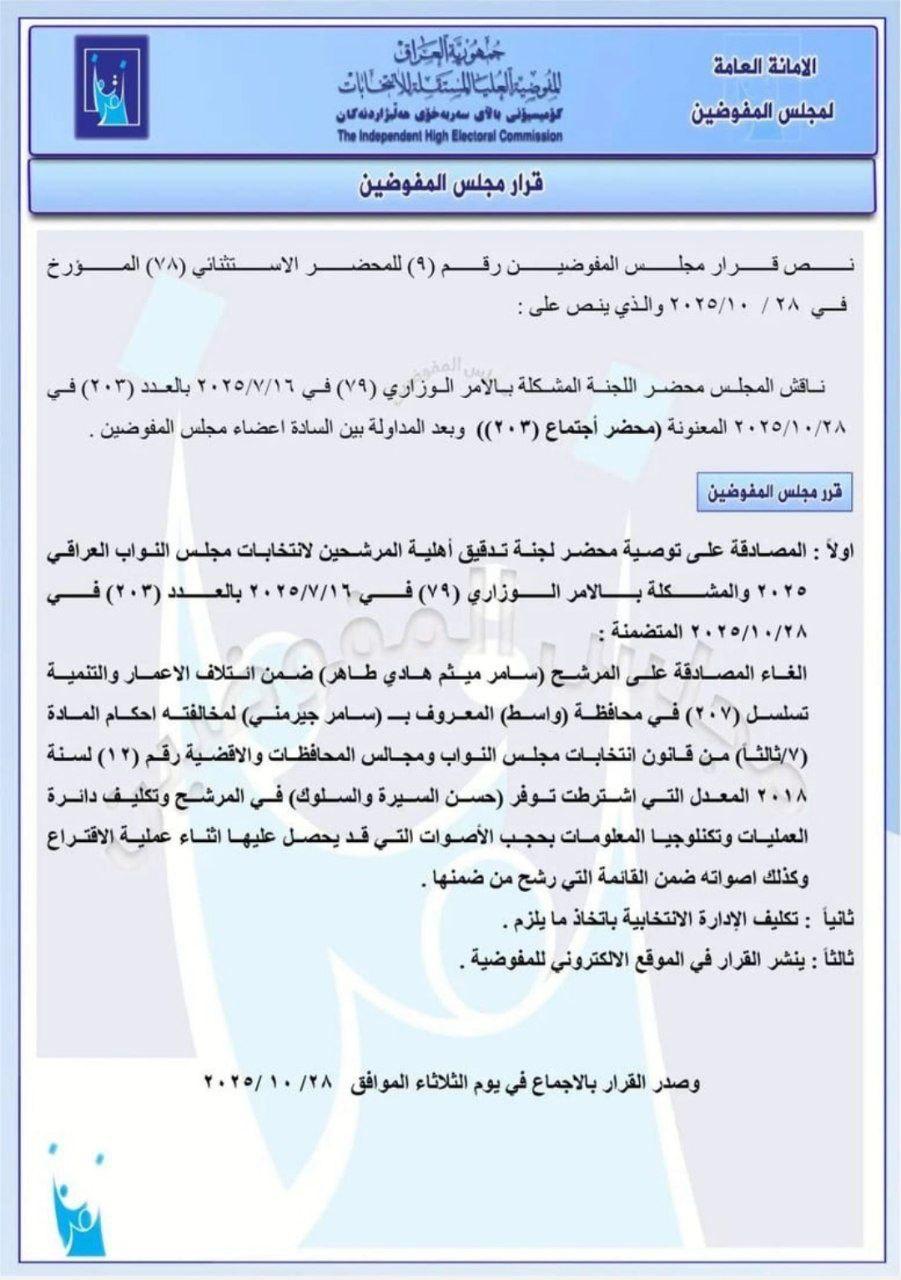 قرر مجلس المفوضين في المفوضية العليا المستقلة للانتخابات، اليوم الثلاثاء، استبعاد المرشح عن ائتلاف الاعمار والتنمية (سامر جيرمني) عن الانتخابات.