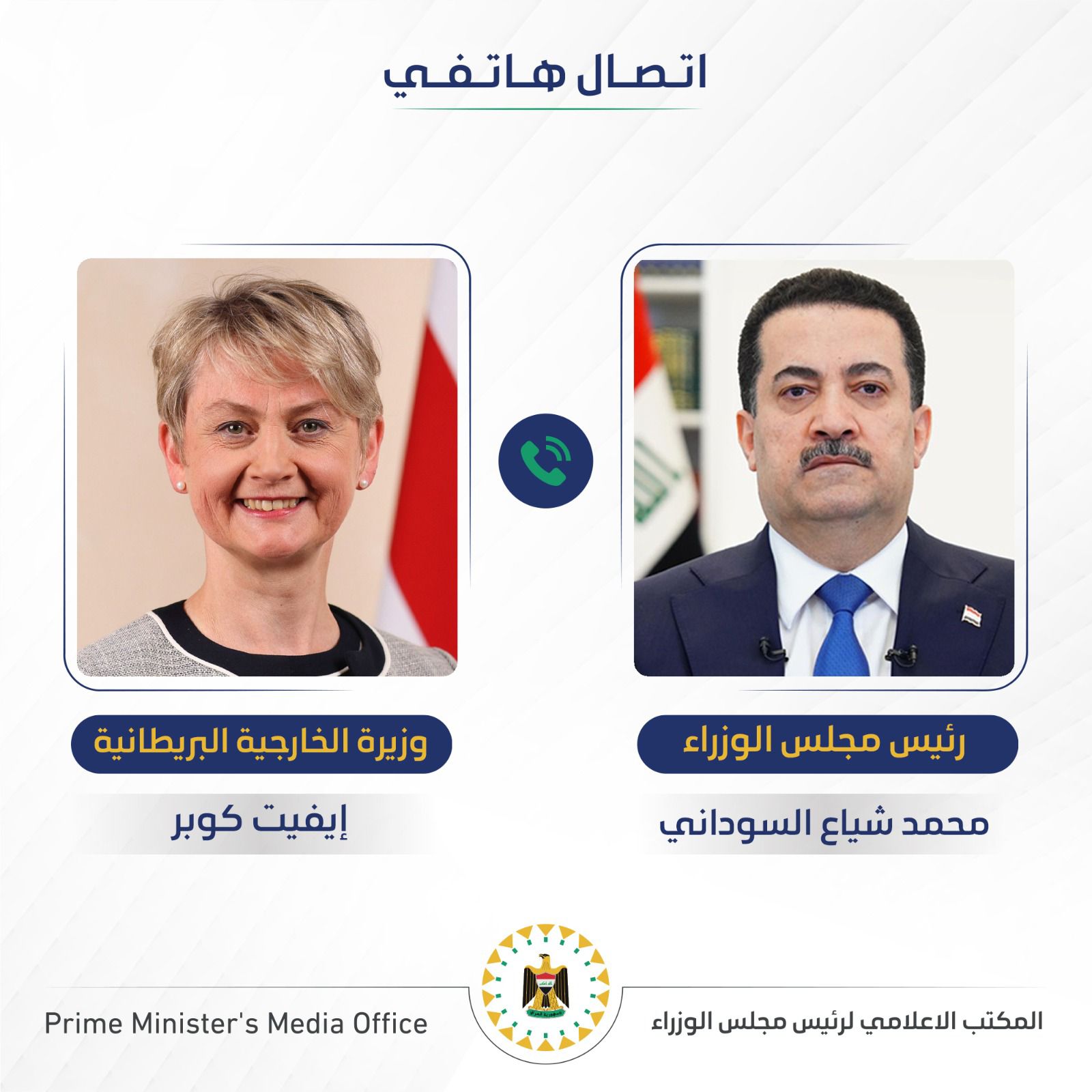 تلقى رئيس مجلس الوزراء محمد شياع السوداني، اليوم الخميس، اتصالاً هاتفياً من وزيرة الخارجية البريطانية إيفيت كوبر، جرى خلاله البحث في العلاقات الثنائية بين البلدين وسبل تعزيزها.