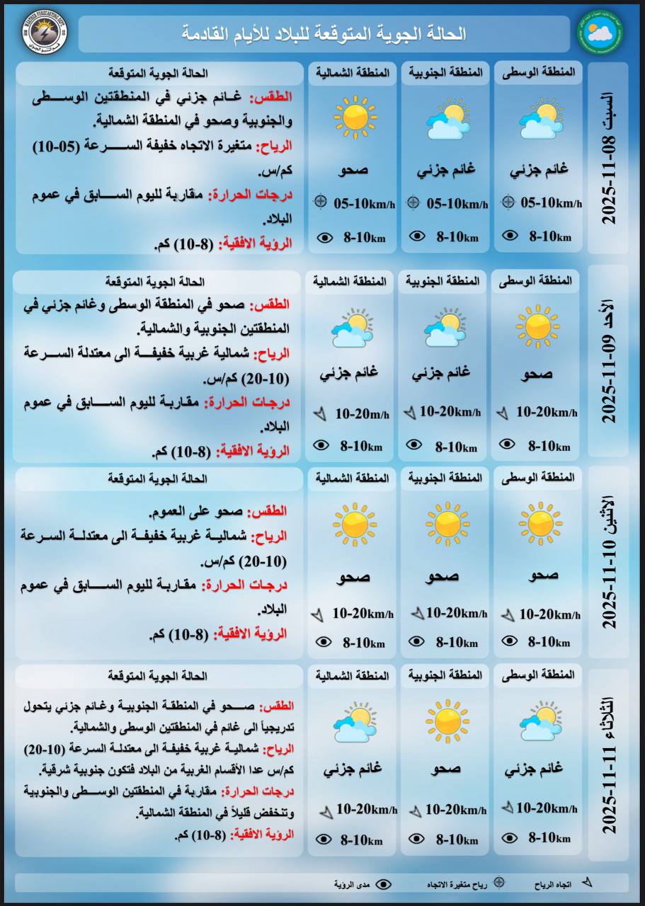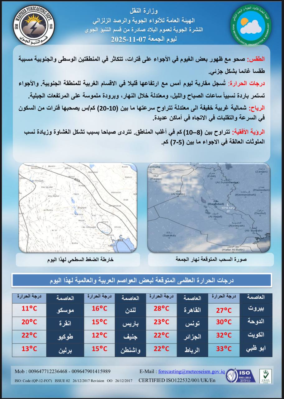 الأنواء الجوية : أجواء باردة ليلاً ومعتدلة نهاراً مع ضباب يعيق الرؤية في العراق