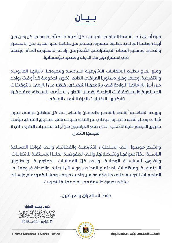 ووفقا لبيان حكومي تلقته "النهرين" ذكر السوداني ما نصه" مرّة أخرى يُنجز شعبنا العراقي الكريم، بكلّ أطيافه المتآخية، وفي كلّ ركن من أرجاء وطننا الغالي، خطوة متميّزة، يتقدّم من خلالها نحو المزيد من الاستقرار والنجاح، وترسيخ النظام الديمقراطي المُعبرّ عن إرادته الدستورية الحرّة، ورغبته في استمرار نهج بناء الدولة وتعضيد مؤسساتها.