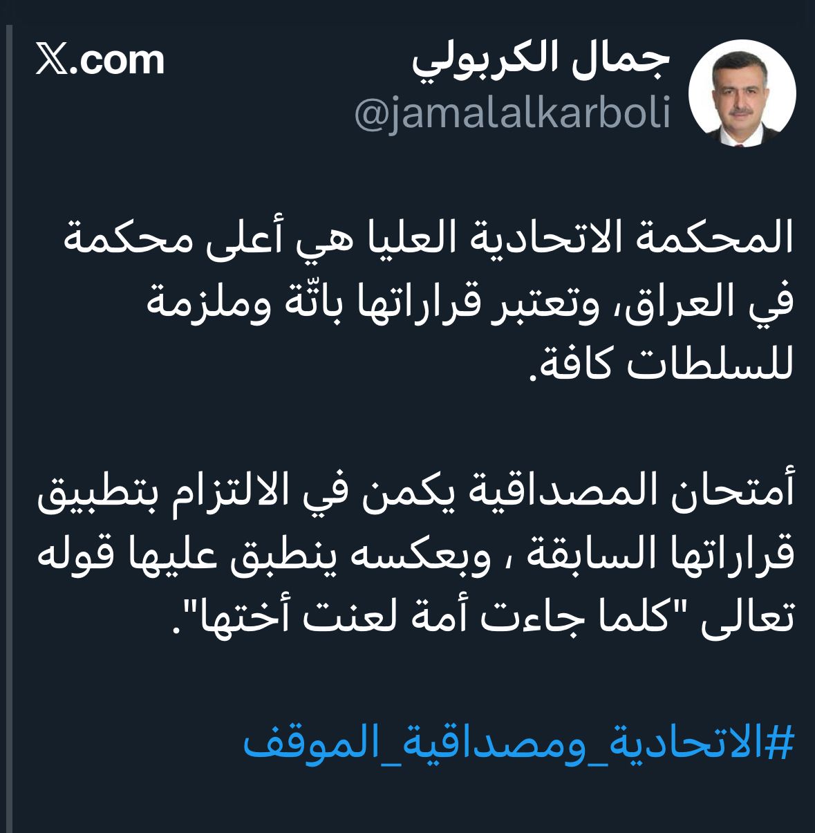 وقال الكربولي في تغريدة على منصة "أكس": إن "امتحان المصداقية يكمن في الالتزام بتطبيق قرارات المحكمة السابقة"، مشيراً إلى أن مخالفة تلك القرارات تعكس ما ينطبق عليه القول القرآني: "كلما جاءت أمة لعنت أختها".