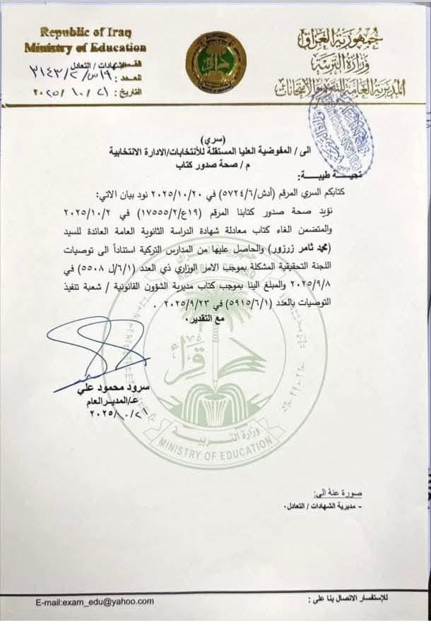 قناة النهرين الفضائية - أكدت وزارة التربية صحة صدور الكتاب المتضمن إلغاء معادلة شهادة الدراسة الثانوية العامة العائدة لمرشح تقدم محمد ثامر زرزور