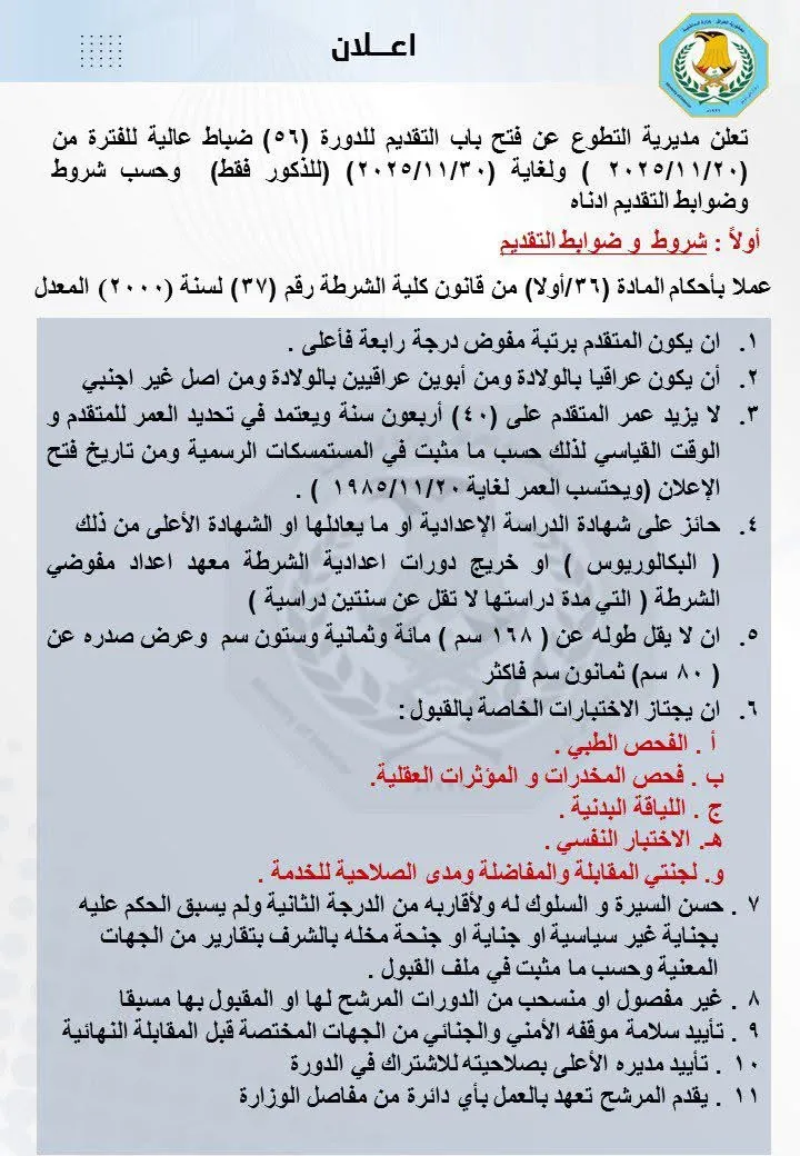 قناة النهرين الفضائية - أعلنت وزارة الداخلية، ضوابط وشروط القبول في الدورة (56) ضباط عالية.