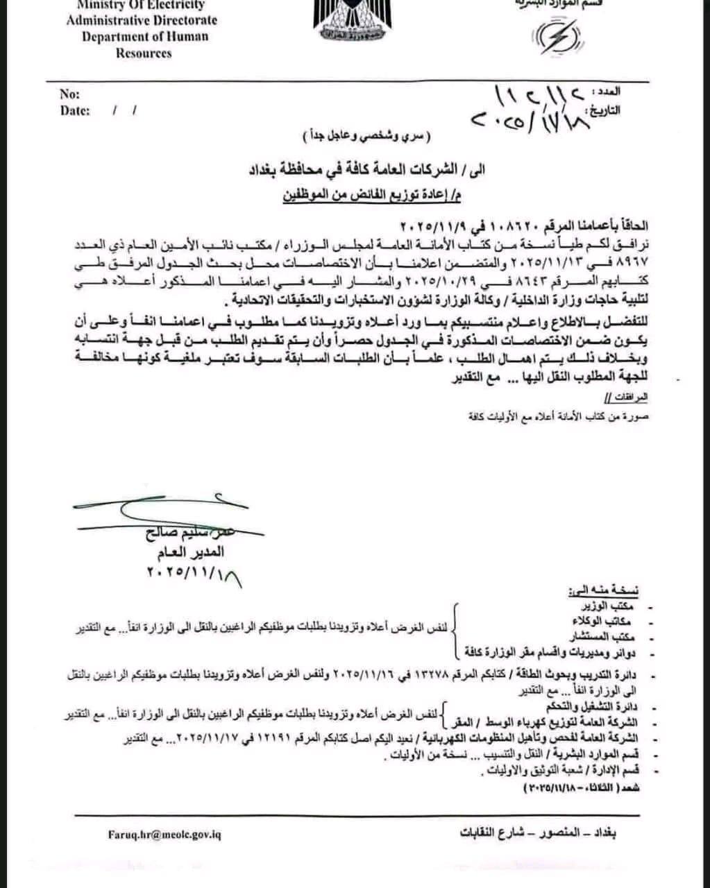 الكهرباء توجه بتوزيع عدد من موظفيها الفائضين على تشكيلات وزارة الداخلية