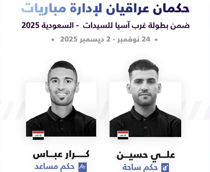 وقال بيان لاتحاد الكرة تلقته "النهرين"، أن "اللجنة المنظمة لبطولة غرب آسيا للسيدان اختارت حكم الساحة علي حسين والحكم المساعد كرار عباس لقيادة مباريات بطولة غرب آسيا للسيدات التي ستقام في مدينة جدة السعودية للفترة من (24) من الشهر الحالي ولغاية الثاني من كانون اول المقبل".