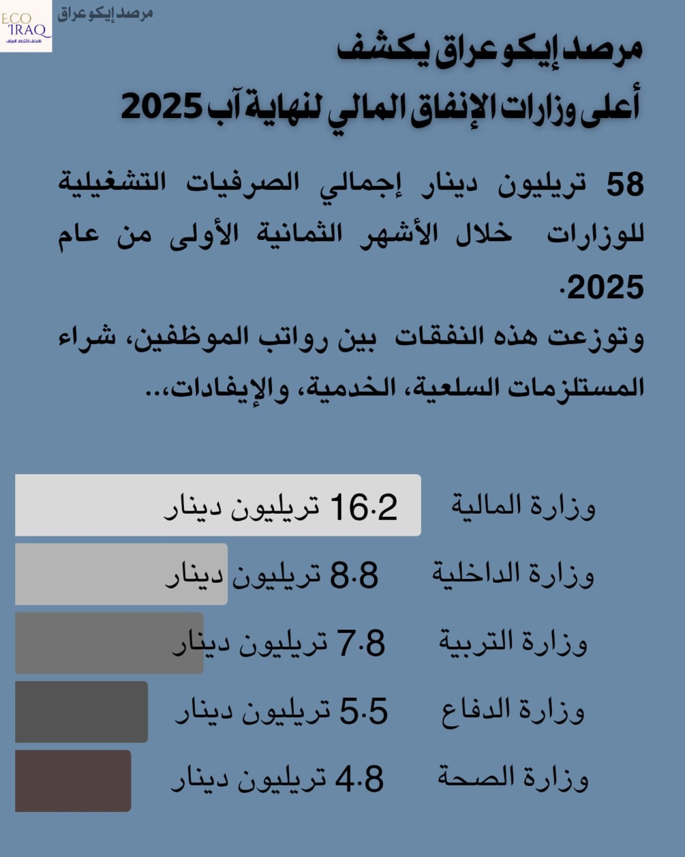 وذكر المرصد في تقرير، تلقته "النهرين"، أن "الإنفاق المرتفع للوزارات لا يتعلق فقط بالرواتب، بل يشمل نفقات أخرى"، مؤكداً أن "إجمالي الصرفيات التشغيلية للوزارات خلال الأشهر الثمانية الأولى من العام ٢٠٢٥ بلغ ٥٨ تريليون دينار".
