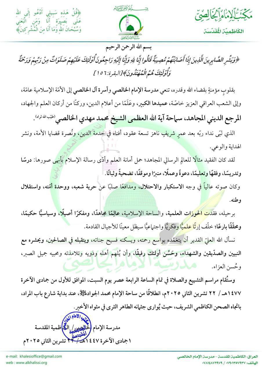 قناة النهرين الفضائية - أعلنت مدرسة الخالصي في الكاظمية، اليوم السبت، رحيل المرجع الديني الشيخ محمد مهدي الخالصي.