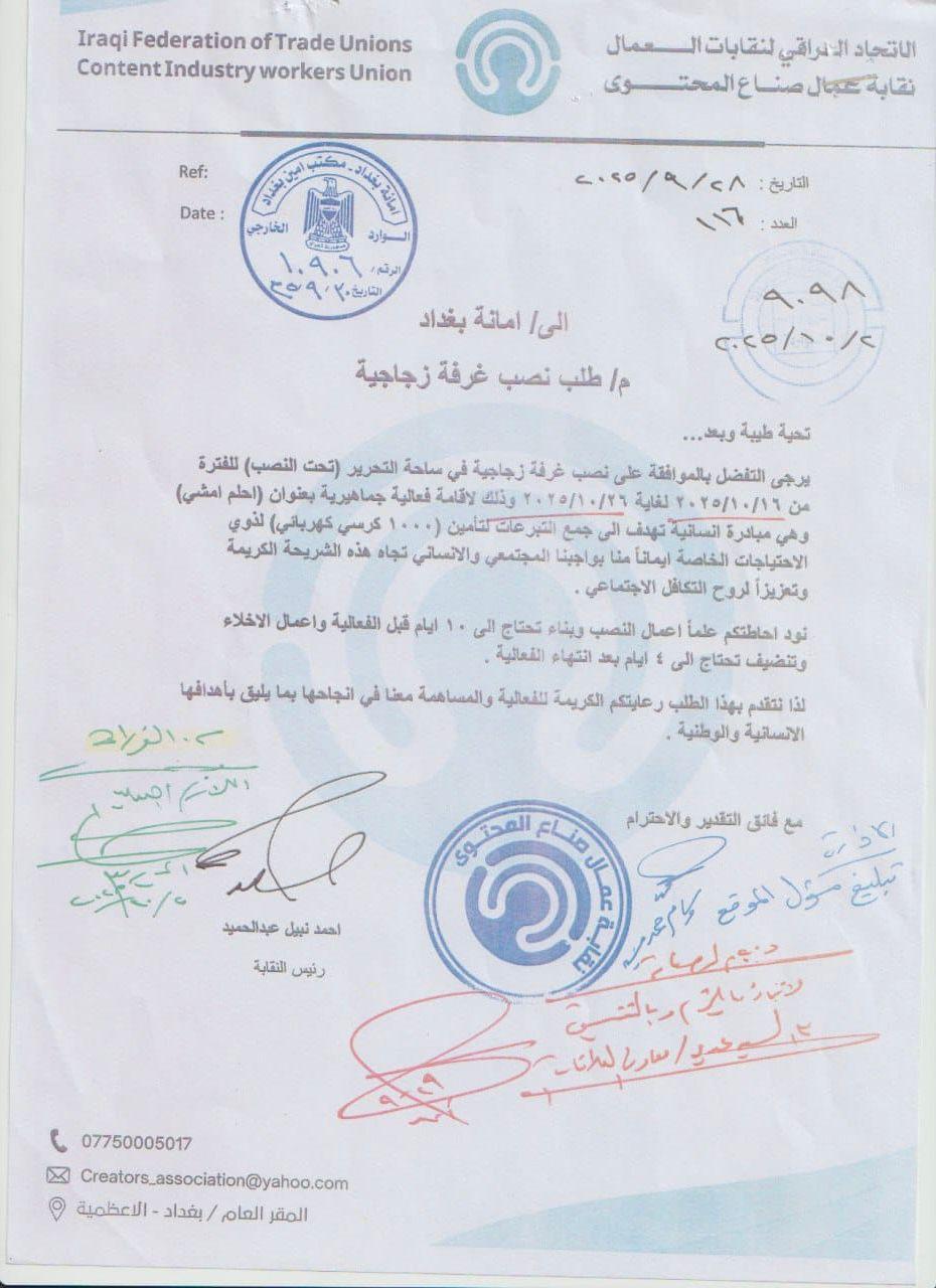 بيان للاتحاد تلقته "النهرين" جاء فيه " يتابع الاتحاد العام لنقابات العمال في العراق ما جرى الإعلان عنه مؤخرًا من إقامة ما تُسمّى بمبادرة “الغرفة الزجاجية” في ساحة التحرير ببغداد، والتي تتضمن دخول مجموعة من صناع المحتوى والمشاهير لمدة عشرة أيام متواصلة بهدف جمع التبرعات لشراء (1000) كرسي كهربائي لذوي الاحتياجات الخاصة."