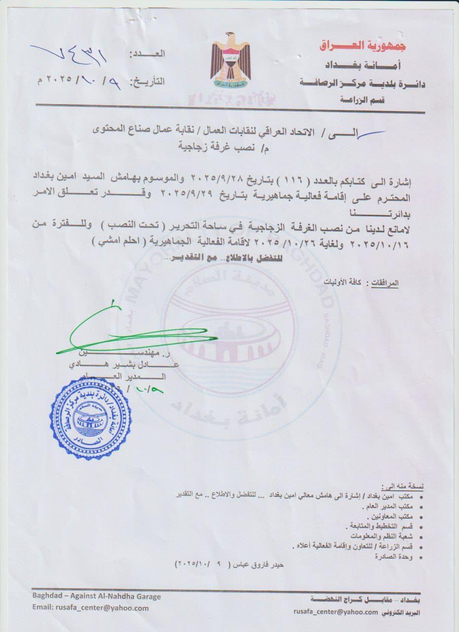 إن الاتحاد العام لنقابات العمال في العراق يؤكد رفضه لأي تجاوز على اسم النقابة أو استغلاله لأغراض غير قانونية، ويشدد على أن حماية المال العام، وصون التنظيم النقابي، مسؤولية وطنية لا يمكن التهاون معها."
