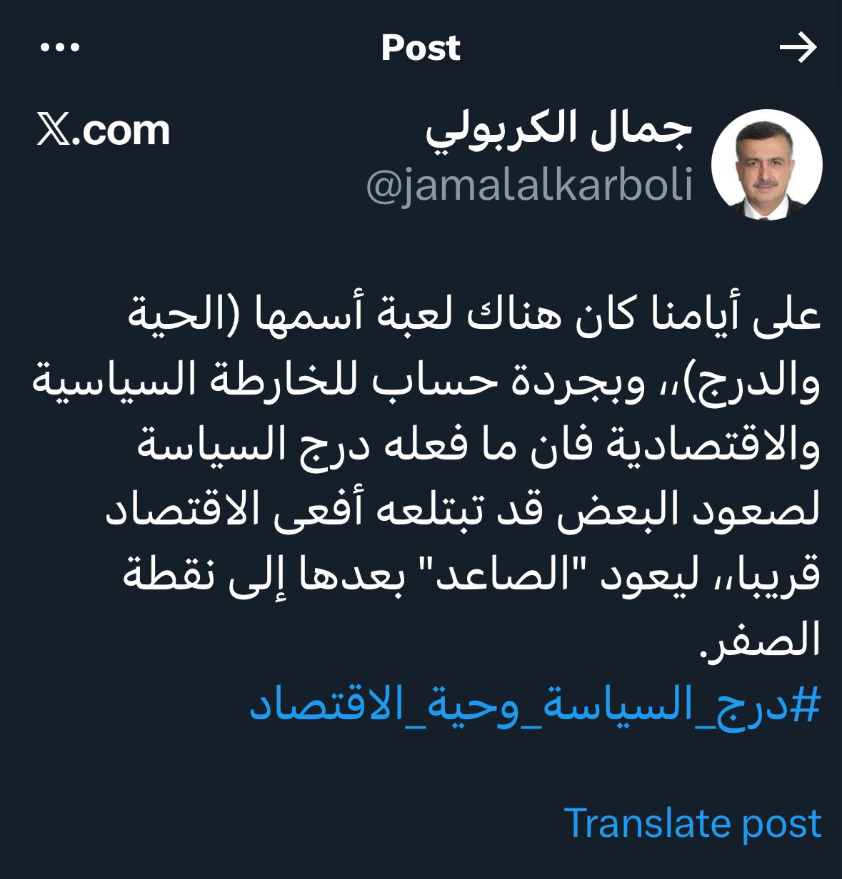 الكربولي: أفعى الاقتصاد تتربص بمن صعدوا على درج السياسة .. "الصاعد سيعود الى نقطة الصفر"