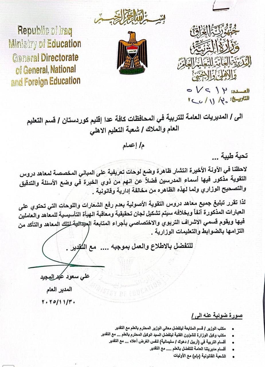 وجهت وزارة التربية، اليوم الأحد، توجيهاً جديداً الى مديرياتها كافة عدا إقليم كردستان بشأن معاهد دروس التقوية.