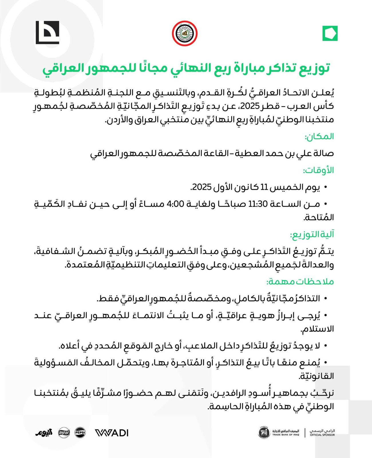 قناة النهرين الفضائية - أعلن الاتحادُ العراقيُّ لكُرةِ القدم، وبالتَنسيقِ مع اللجنةِ المُنظمةِ لبُطولةِ كأس العرب – قطر 2025، عن بدءِ تَوزيعِ التَذاكرِ المجّانيّةِ المُخصّصةِ لجُمهورِ منتخبنا الوطنيّ لمُباراةِ ربعِ النهائيِّ بين منتخبي العراق والأردن.