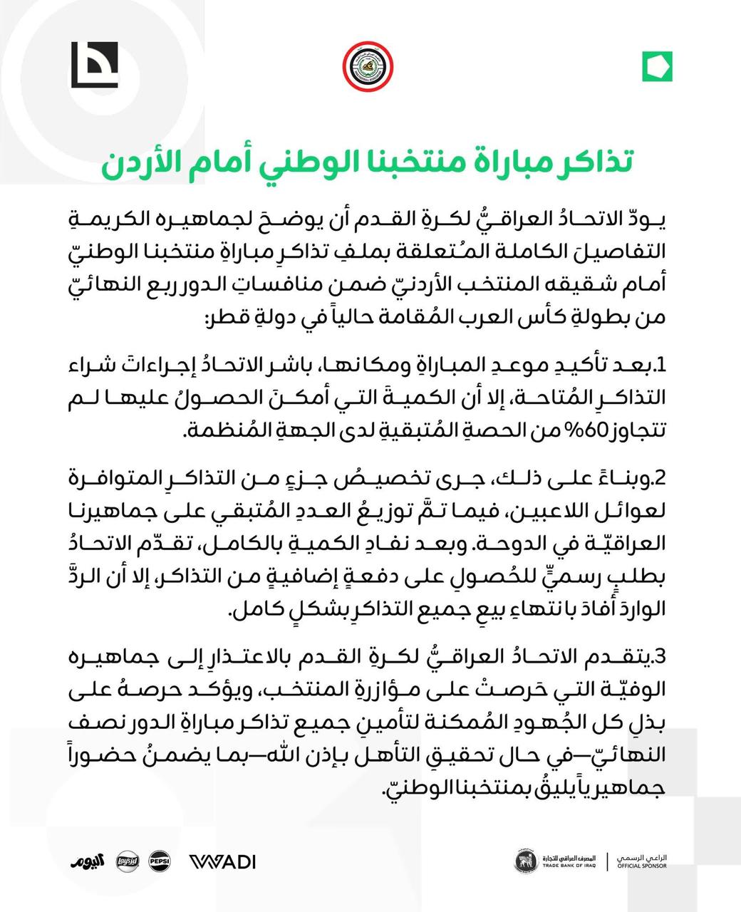 3. يتقدم الاتحادُ العراقيُّ لكرةِ القدم بالاعتذارِ إلى جماهيره الوفيّة التي حَرصتْ على مؤازرةِ المنتخب، ويؤكد حرصهُ على بذلِ كل الجُهودِ المُمكنة لتأمينِ جميع تذاكر مباراةِ الدور نصف النهائيّ—في حال تحقيقِ التأهل بإذن الله—بما يضمنُ حضوراً جماهيرياً يليقُ بمنتخبنا الوطنيّ.