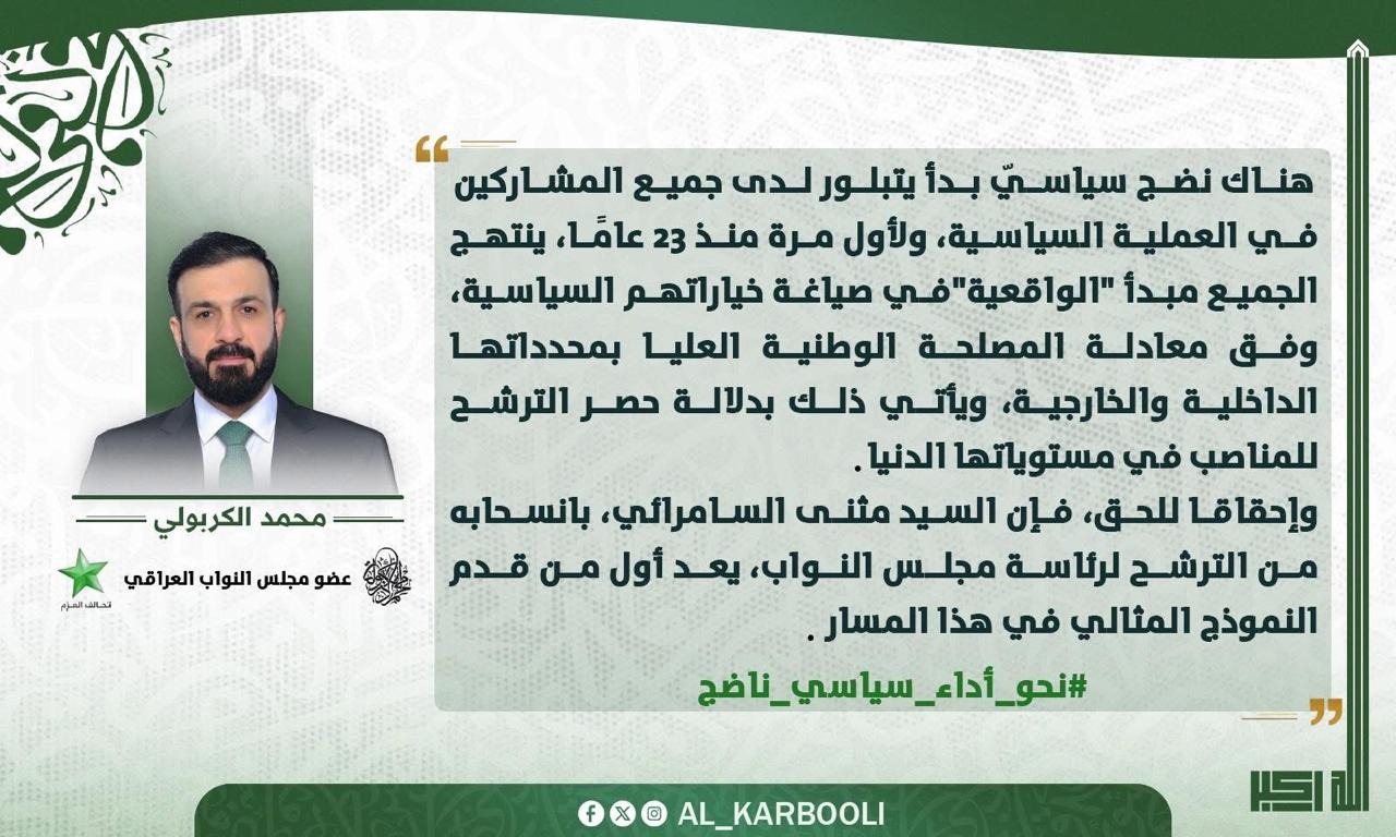 وأشار في تدوينته إلى أن انسحاب النائب مثنى السامرائي من الترشح لرئاسة مجلس النواب يمثل "النموذج المثالي" في هذا المسار، لما يعكسه من تقديم للمصلحة العامة على الطموحات الشخصية.