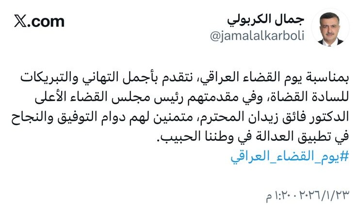 وقال الكربولي في تدوينة على منصة "إكس" : "بمناسبة يوم القضاء العراقي، نتقدم بأجمل التهاني والتبريكات للسادة القضاة، وفي مقدمتهم رئيس مجلس القضاء الأعلى الدكتور فائق زيدان المحترم، متمنين لهم دوام التوفيق والنجاح في تطبيق العدالة في وطننا الحبيب".