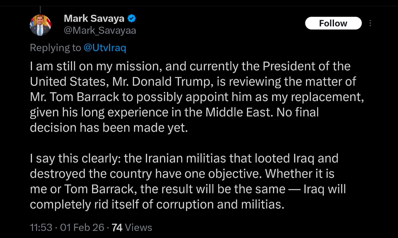وأضاف سافايا أن "سواء استمرت المهمة تحت قيادتي أو قيادة السيد باراك، فإن الهدف يبقى دون تغيير: مواجهة الميليشيات المدعومة من إيران في العراق، وإنهاء الفساد الممنهج، ودعم الشعب العراقي في بناء دولة مستقرة وذات سيادة ومزدهرة".