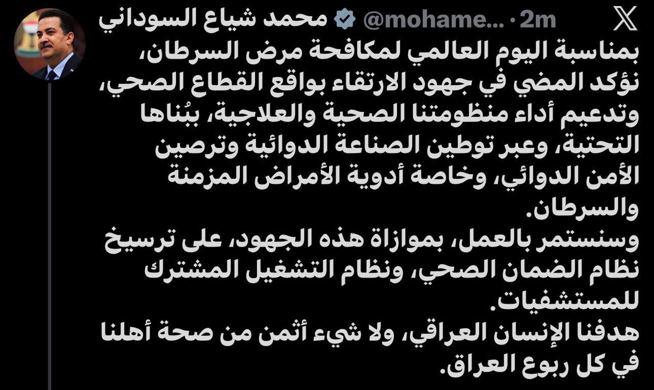 بمناسبة اليوم العالمي لمكافحة مرض السرطان .. السوداني يؤكد دعم القطاع الصحي والأمن الدوائي