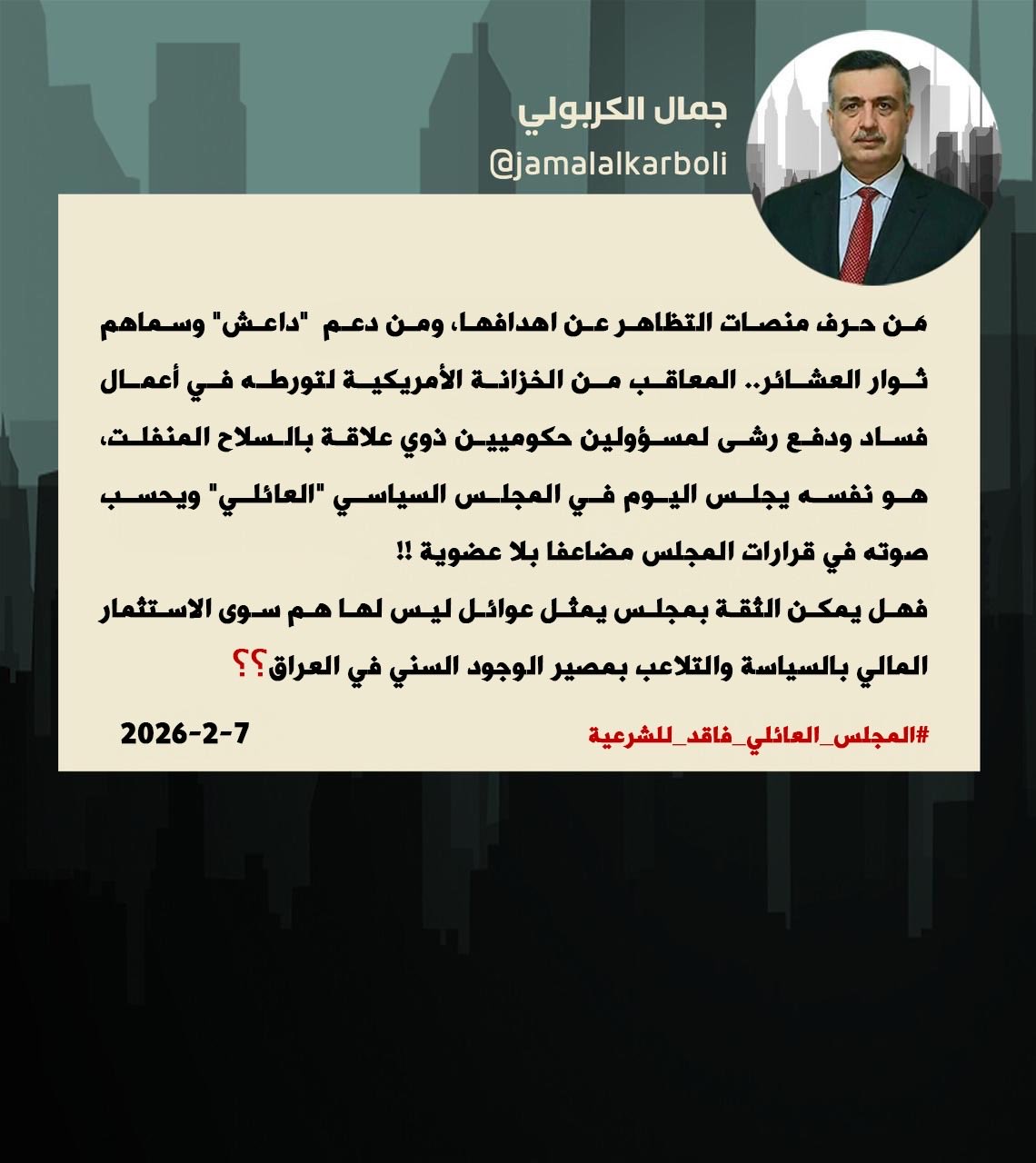 قناة النهرين الفضائية - نشر رئيس حزب الحل الوطني، الدكتور جمال الكربولي، تدوينة انتقد فيها ما وصفه بـ"المجلس السياسي العائلي"، معتبرًا أنه فاقد للشرعية ولا يمكن الوثوق به في تمثيل الوجود السني في العراق.