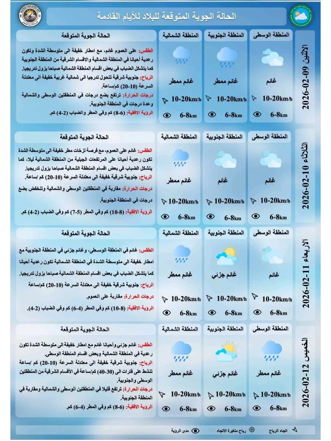 الأنواء الجوية: ارتفاع قليل بدرجات الحرارة مع زخات مطرية وتشكل الضباب