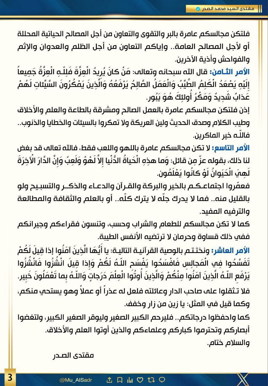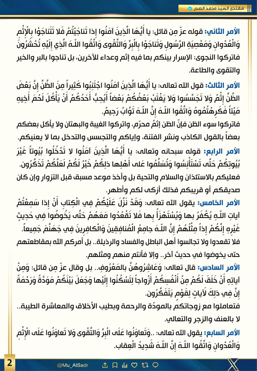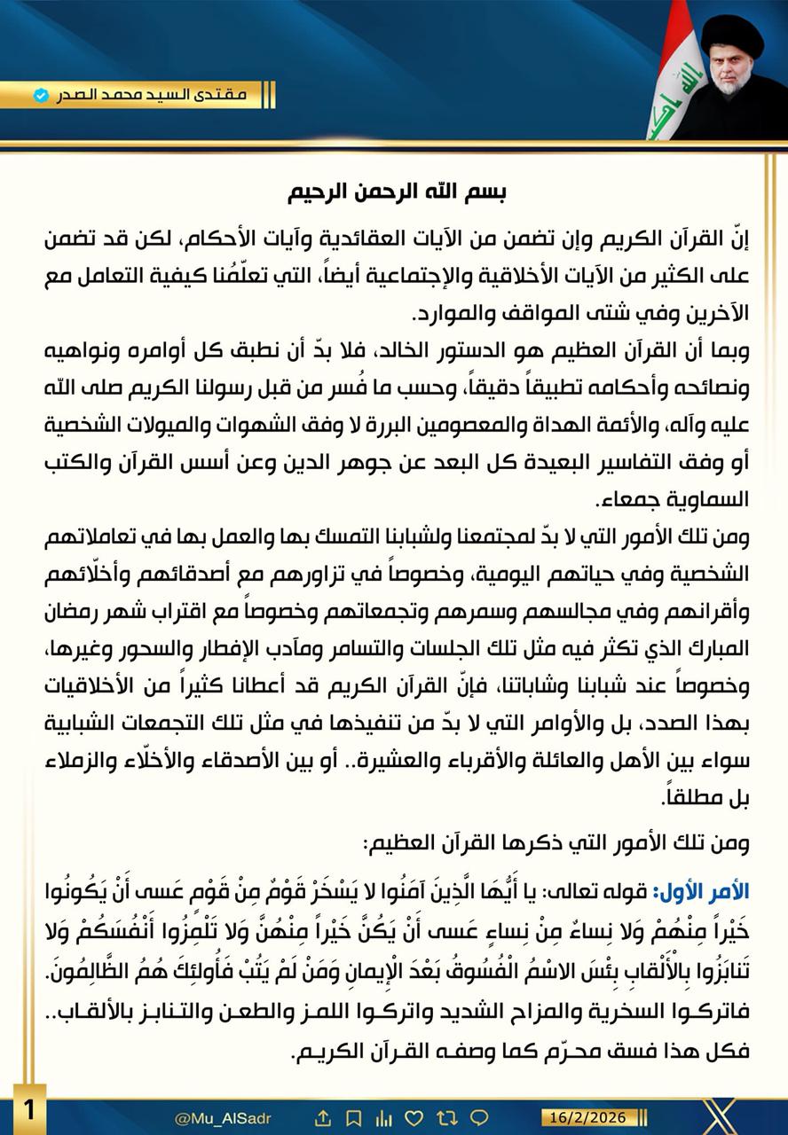 قناة النهرين الفضائية - دعا زعيم التيار الوطني، مقتدى الصدر، مساء اليوم الاثنين، أتباعه إلى الالتزام بتعاليم القرآن الكريم والامتثال لأوامره ونواهيه .