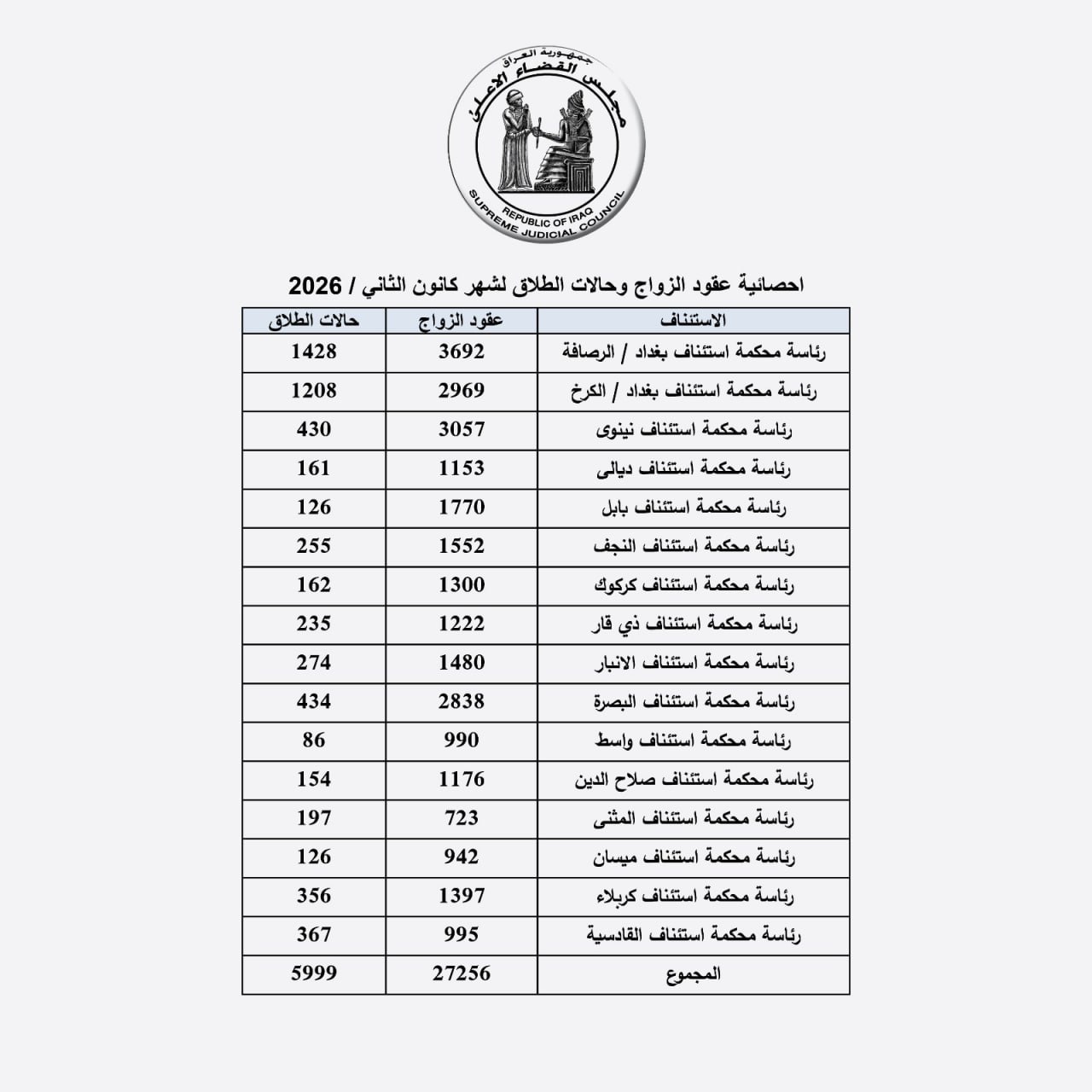 قناة النهرين الفضائية - أعلن مجلس القضاء الأعلى العراقي، اليوم الثلاثاء، إحصائيته الشهرية الخاصة بعقود الزواج وحالات الطلاق المسجَّلة في محاكم الاستئناف بمختلف مناطق العراق لشهر كانون الثاني 2026.