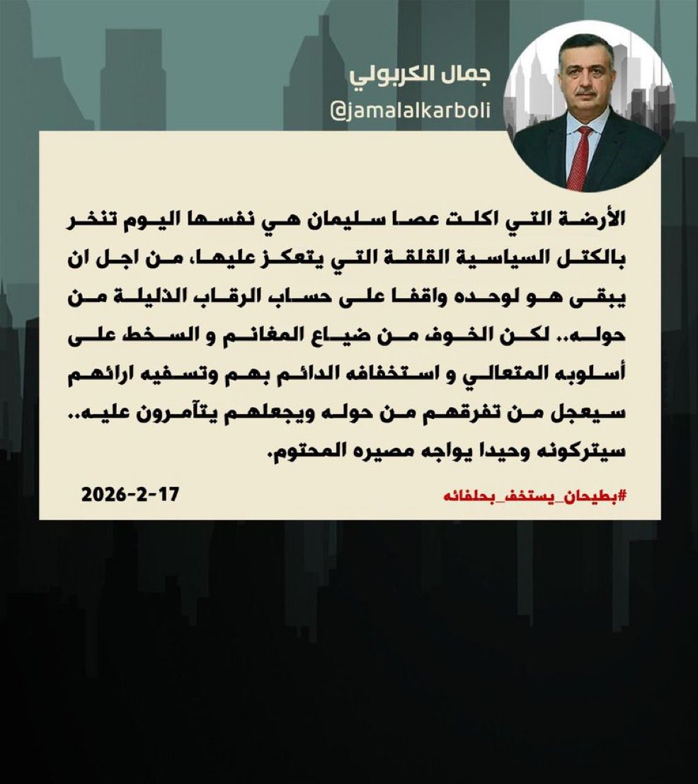 الكربولي وفي تدوينة له على منصة "أكس"، قال ان "الارضة التي اكلت عصا سليمان هي نفسها اليوم تنخر بالكتل السياسية القلقة التي يتعكز عليه بطيحان، ليبقى وحده واقفا على حساب الرقاب الذليلة من حوله".