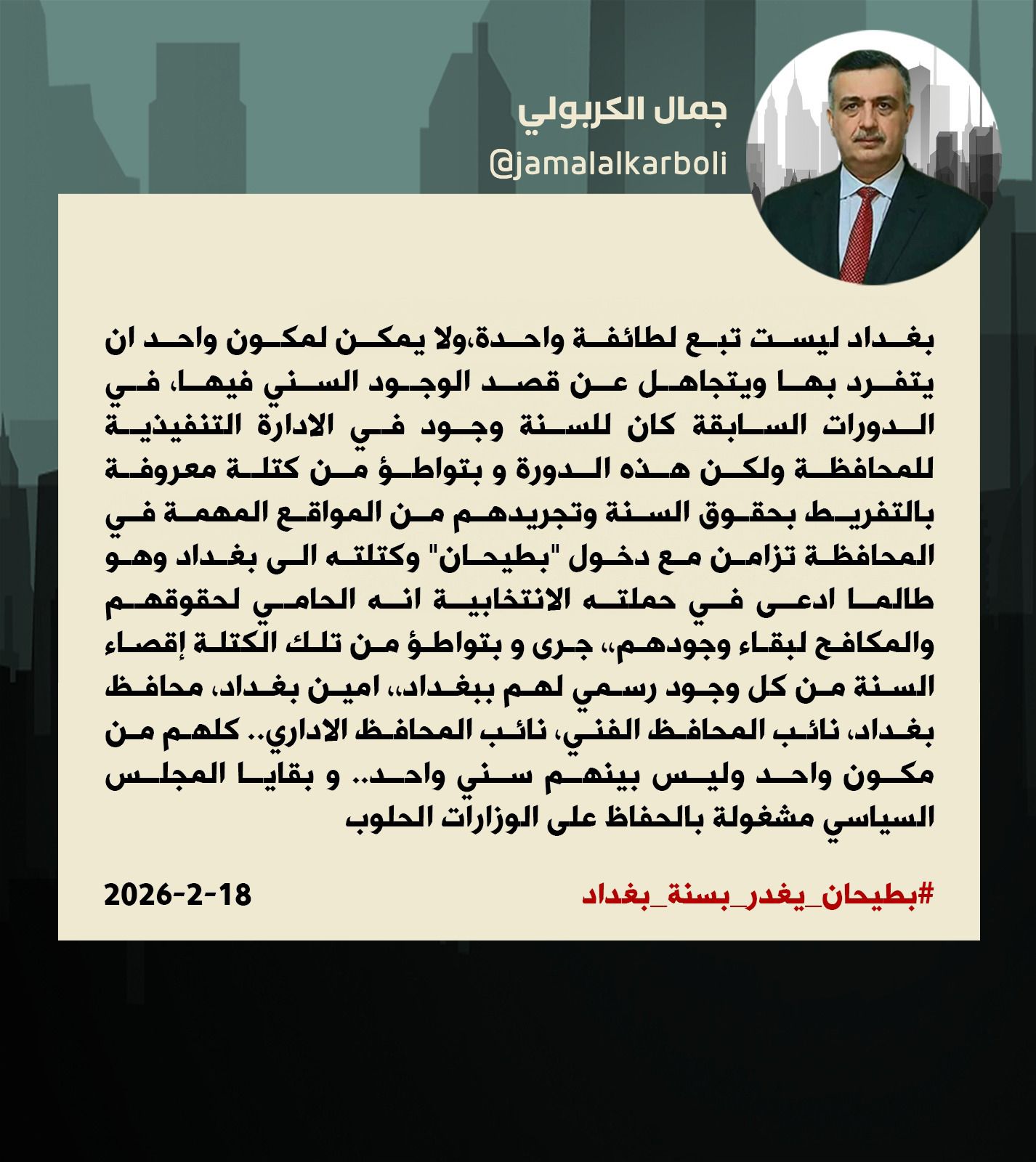واكد ان امين ومحافظ ونائب المحافظ الفني والإداري للعاصمة بغداد كلهم من مكون واحد وليس بينهم سني، مشيرا الى ان بقايا المجلس السياسي مشغولة بالحفاظ على الوزارات الحلوب، فيما اختتم تغريدته بوسم، بطيحان يغدر بسنة بغداد.
