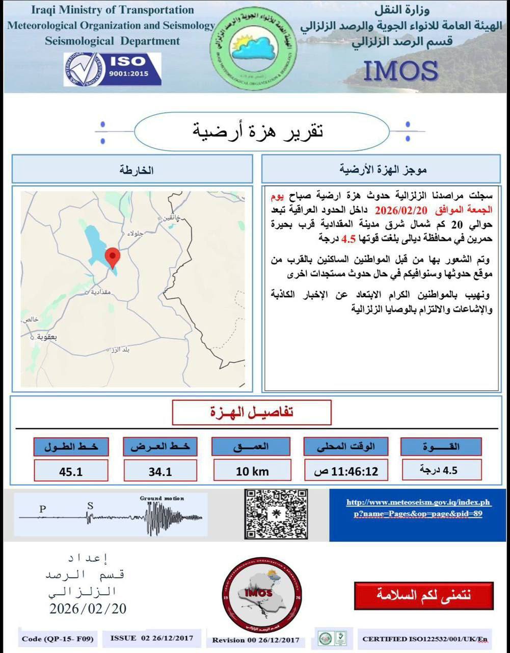 هزة أرضية بقوة 4.5 تضرب شمال شرق المقدادية في ديالى