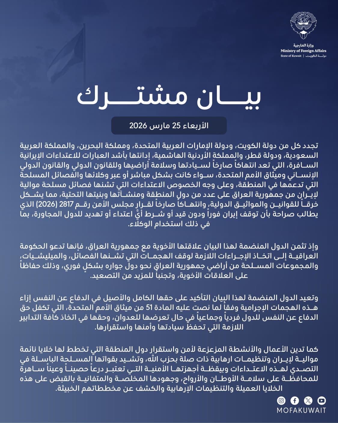 بيان كويتي إماراتي بحريني سعودي قطري أردني أدان اعتداءات فصائل مسلحة موالية لإيران من العراق على دول بالمنطقة.