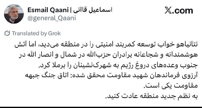 وقال قاآني إن ما وصفها بـ"جبهة المقاومة" أصبحت موحّدة عبر غرفة عمليات مشتركة، معتبراً أن هذا التطور يحقق ما كان يتمناه قادة "المقاومة" الذين قُتلوا في السنوات الماضية.